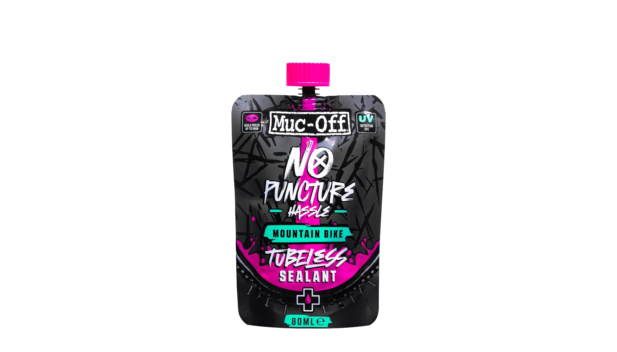 Le produit antifuite pour pneu sans chambre à air anti crevaison de la gamme Muc-Off est performant dans les conditions de course les plus extrêmes. Les molécules de pointe remplissent les plus gros trous et les déchirures, tandis que le latex avancé forme instantanément un joint solide. Cette  formule contient également un système unique de détection des UV qui met en évidence les perforations.