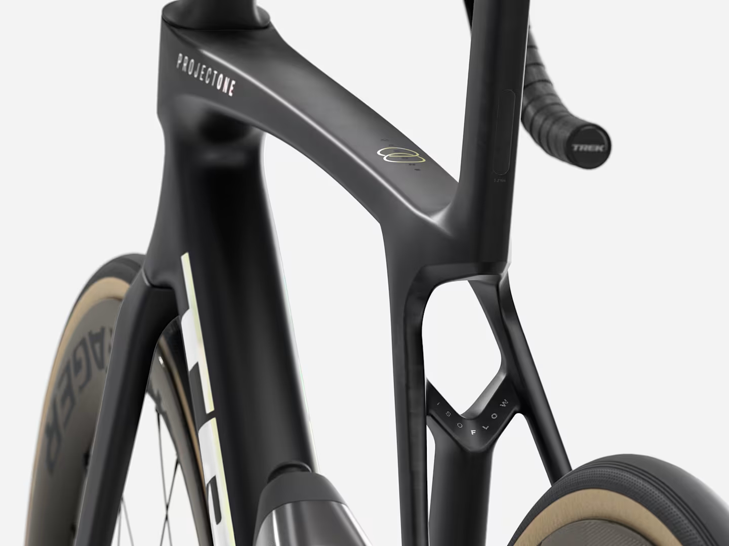 Cintre/potence intégré Trek Aero RSL Route, OCLV Carbon, Race Fit, profondeur de 80 mm, hauteur de 124 mm, largeur de 39 cm aux cocottes, largeur de 42 cm dans les creux, longueur de potence de 100 mm